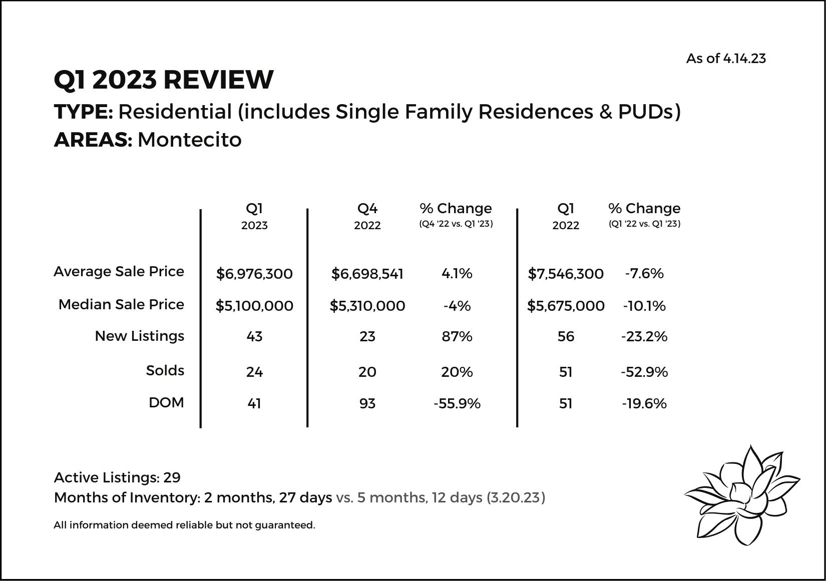 With new listings in Montecito up 87% compared to Q4 of 2022, sales rose by 20%. The average and median sale prices in Q1 of 2023 were up 4.1% and down 4% in comparison to Q4 of 2022. And in comparison to Q1 of 2022, the average sale price was down 7.6% while the median sale price was down 10%. Days on market for Q1 2023 dropped considerably to 41 days which is a 56% decline from Q4 2022 when it took 93 days on average for a home to sell. The Months of Inventory in Montecito is currently at 2 months and 27 days down from 5 months and 12 days on March 20, 2023.