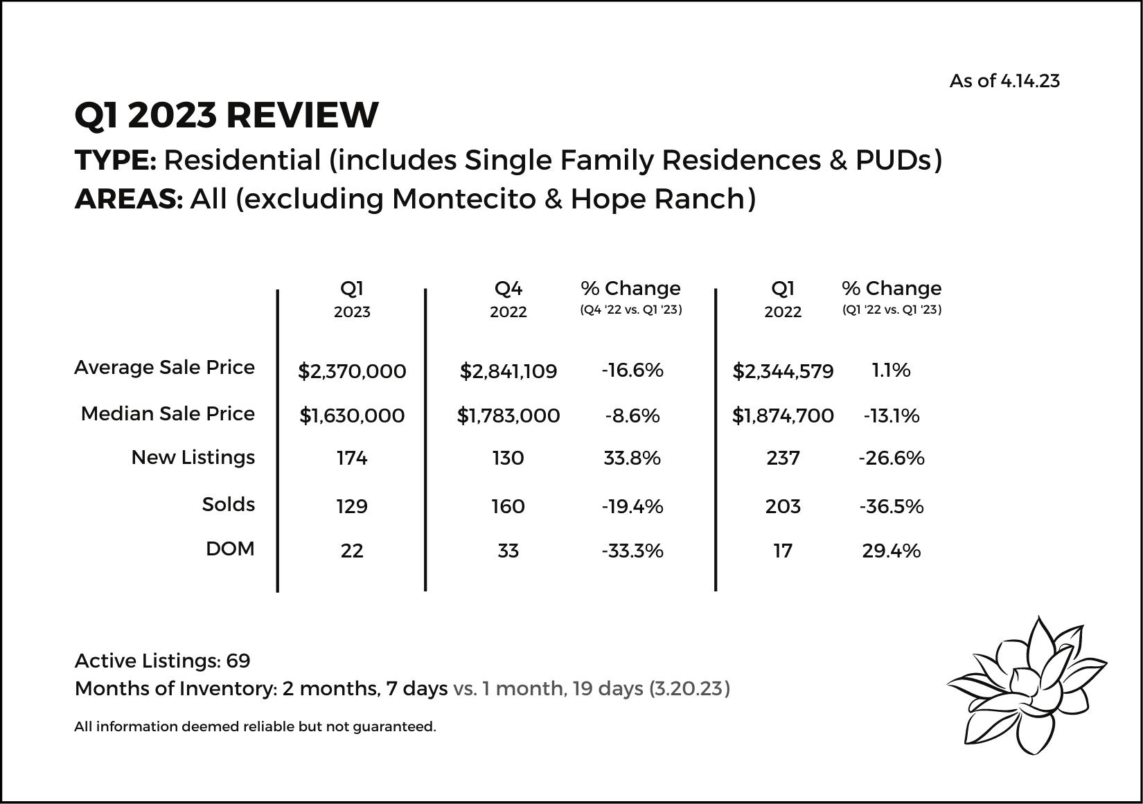 Let’s take a look at Q1 2023 to get a sense of what’s happening in today’s market. The average and median sales prices for single-family homes in all areas, excluding Montecito and Hope Ranch, were down 16.6% and 8.6% respectively from Q4 of 2022. In comparison to Q1 2022, the average sale price, $2,370,000, was roughly at par, and the median sales price, $1,630,000, was down 13.1%. Sales were down 19.4% in comparison to the last quarter of last year and down 36.5% in comparison to Q1 of 2022. Days on Market is averaging 22 days, down 33.3% in comparison to Q4 2022 and up 30% from Q1 2022, meaning homes are selling faster in 2023 in comparison to the last quarter of 2022 but slightly slower than in Q1 2022. The Months of Inventory for this category of homes is 2 months and 7 days, up slightly from 1 month and 19 days on March 20, 2023.