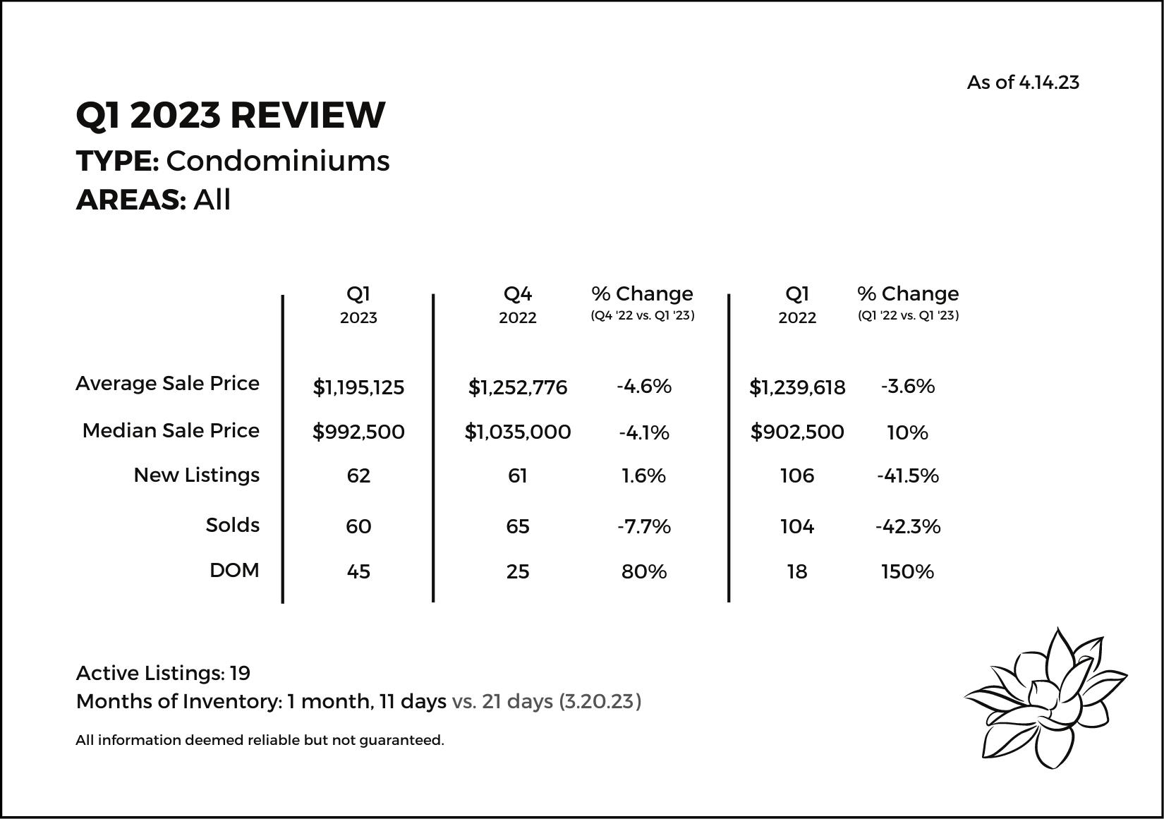 The condominium market was off slightly compared to Q4 of 2022 with the average and median sale prices down 4.6% and 4.1% respectively. The median sale price, however, was up 10% in comparison to Q1 2022. New listings were roughly at par with Q4 2022 but were considerably down in comparison to Q1 2022 by 41.5%. Sales were down 7.7% compared to Q4 2022 and down 42.3% compared to Q1 2022. Days on market were down 80% compared to Q4 2022 and down 150% compared to Q1 2022. Months of Inventory while up a hair remains dramatically low at 1 month and 11 days in comparison to only 21 days on March 20, 2023.