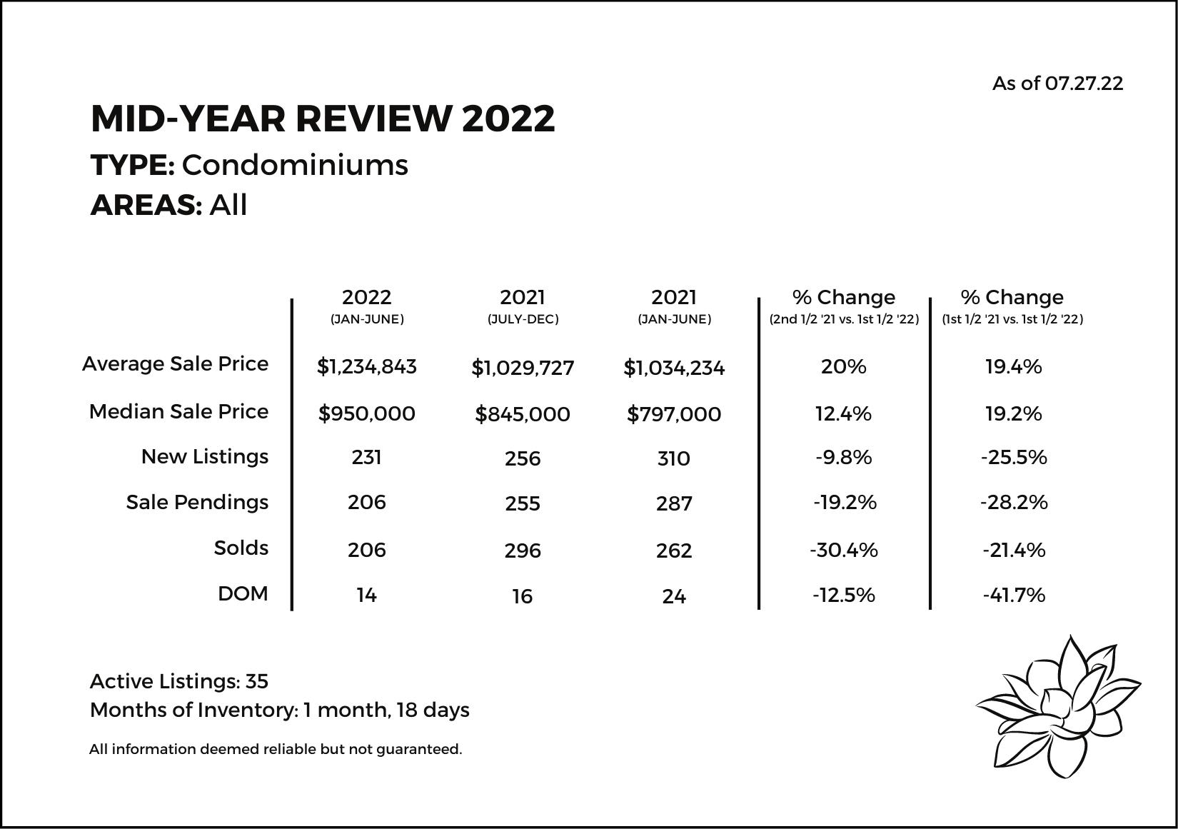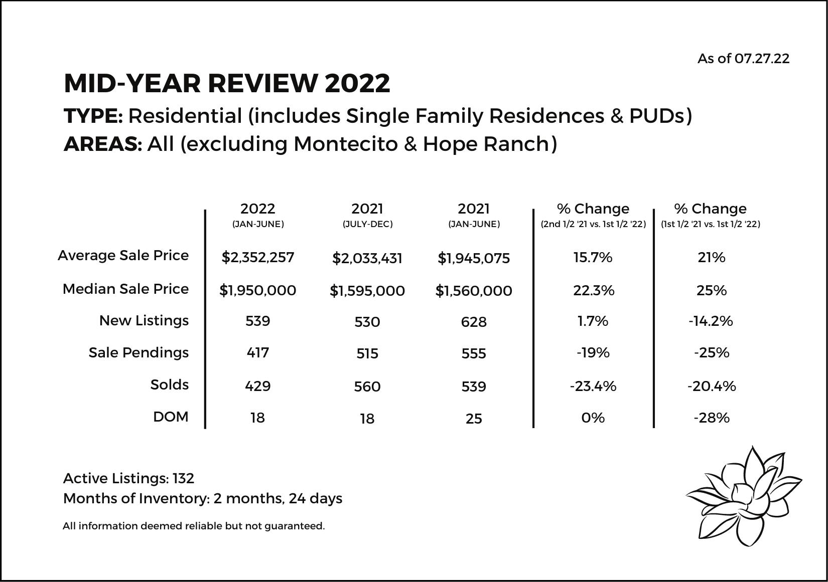 The first half of 2022 was astounding, and I’d say, unsustainable. Inventory was at an all time low, and the Average and Median sale prices were up double digits Year-to-Date compared to the first half of 2021 with single family residences enjoying the greatest gains at 21% and 25% respectively.