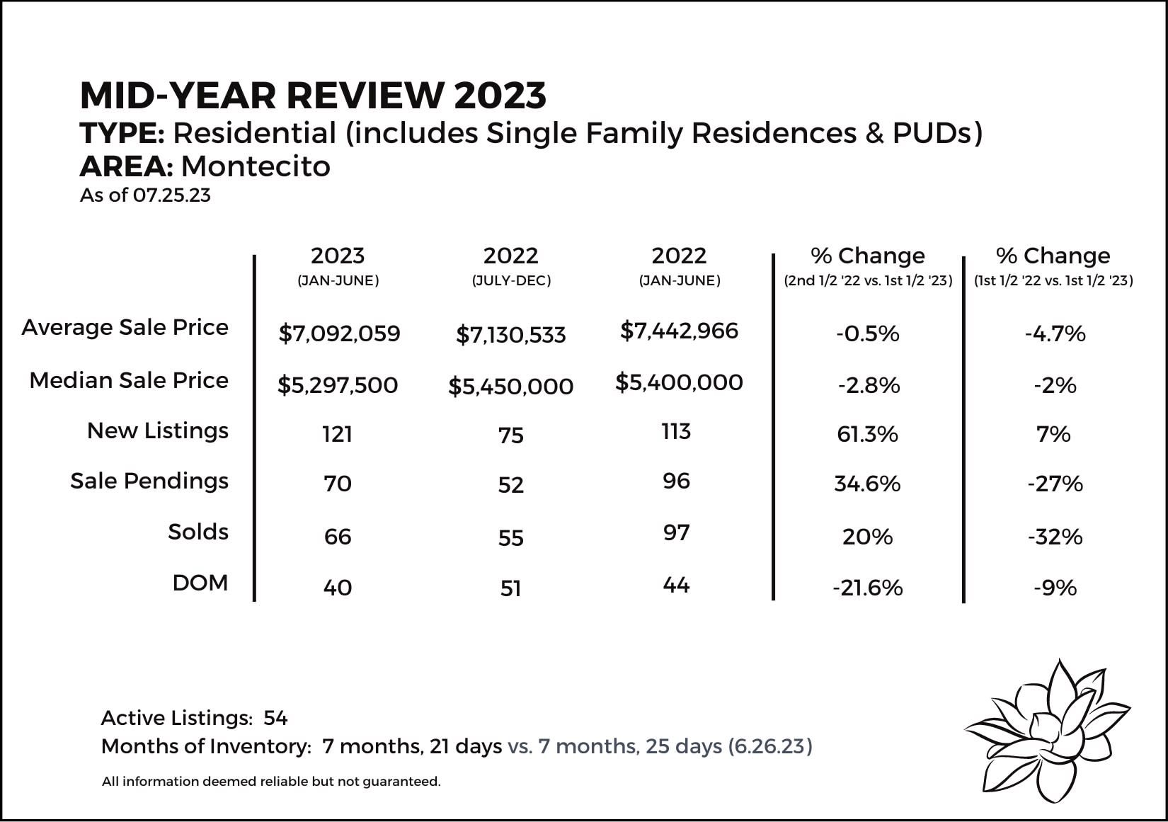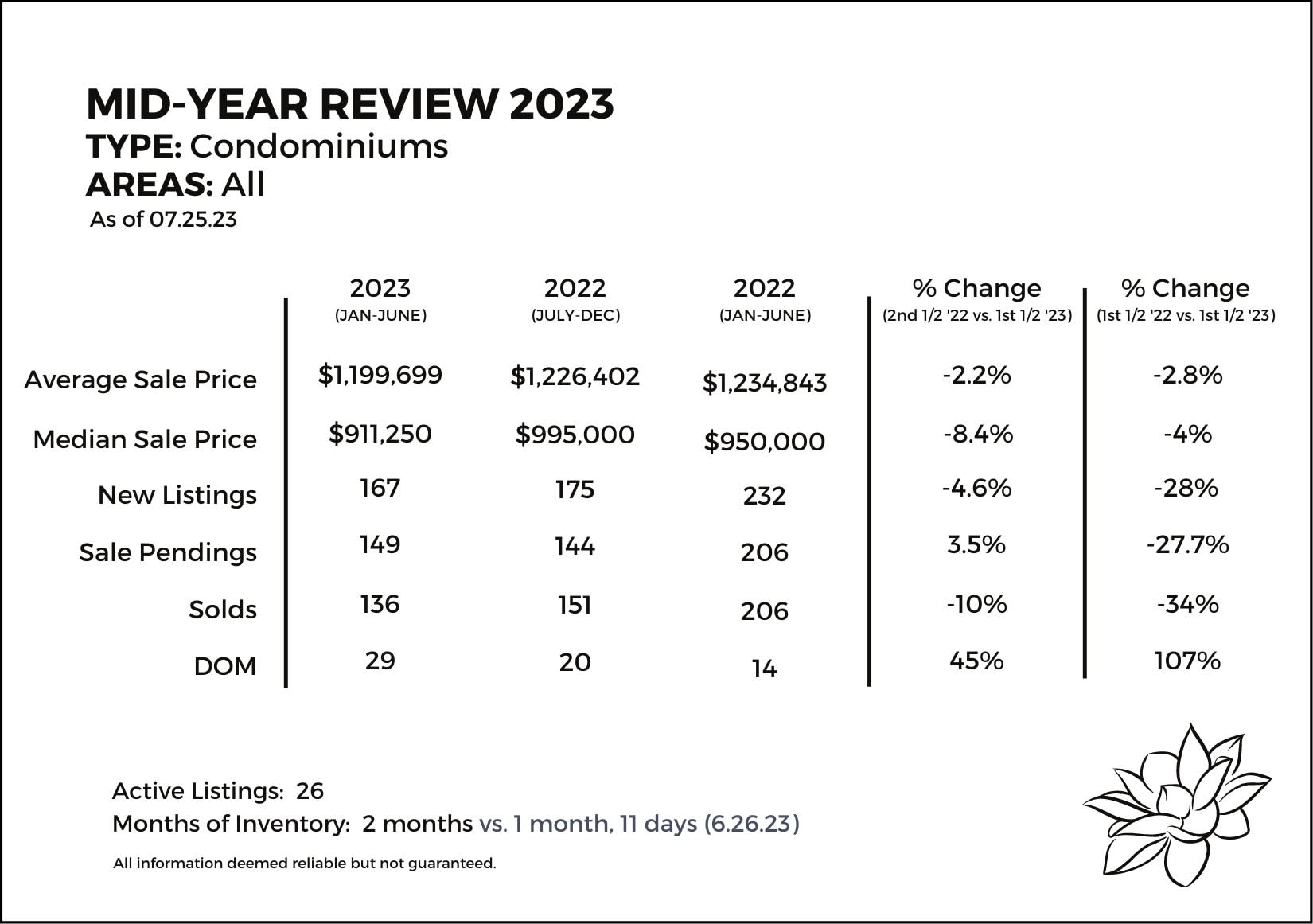 The average and median sale prices for single-family residences were down year-to-date compared to the first half of 2022 by -5% and -7.7% respectively. And new listings were down by -25%. This, of course, continued to put downward pressure on sales which were off by 31.7%. Inventory is slightly up this month at 2 months and 20 days compared to 2 months on 6/23/23.