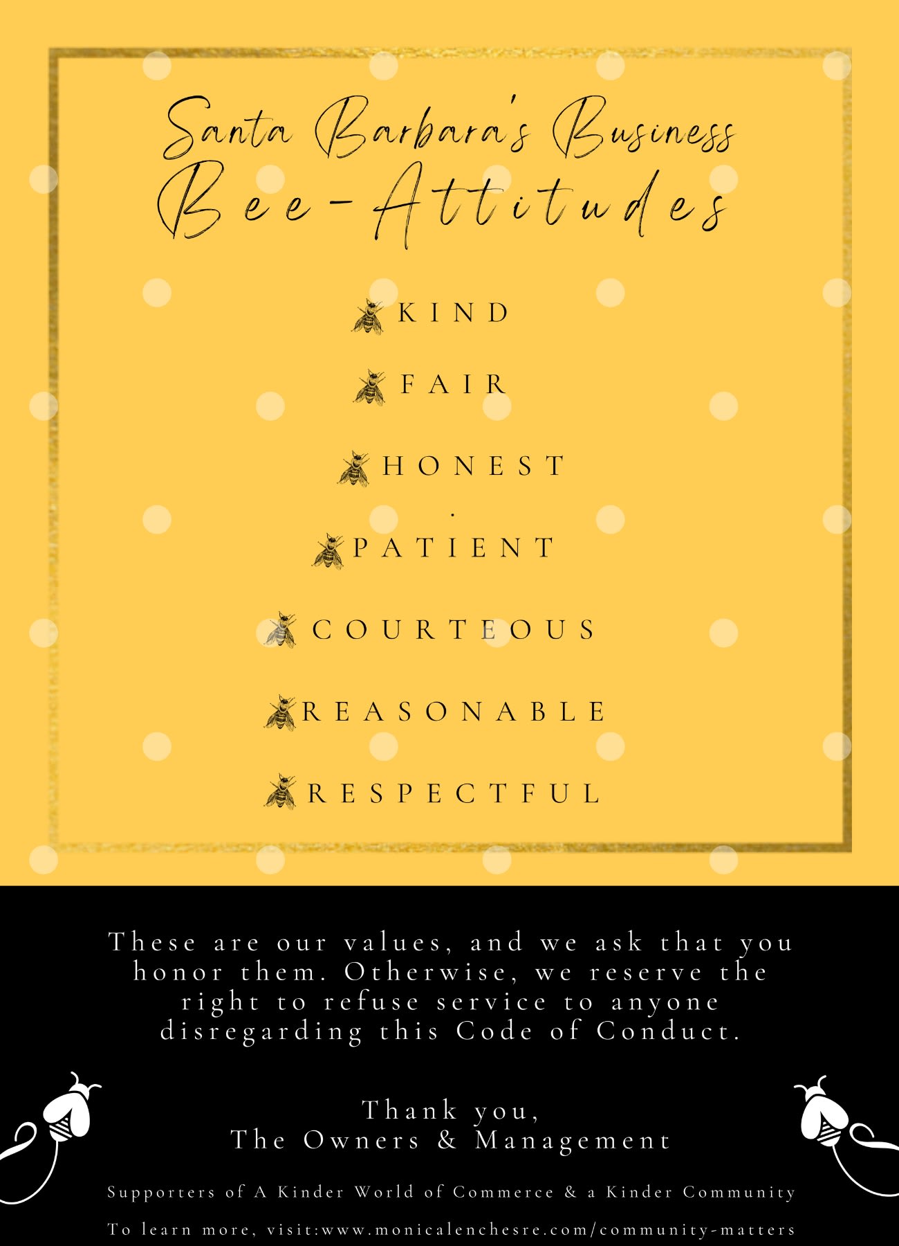 For many years, I’ve heard similar stories from local business owners and residents about how things are changing in Santa Barbara. Granted this change has been going on for thirty years, but since COVID, it’s become far more obvious. More and more, sadly, we’re experiencing and witnessing behaviors that are rude, pushy, less tolerant and more entitled. But what if we, as local business owners and residents, came up with a set of kinder, more life-affirming values that establish clear expectations around codes of conduct prior to walking into and engaging with a business? I’ve been pondering this question for months, and then finally it hit me….in the shower of all places! Beatitudes…like “be kind, be fair, etc.” But then I remembered that Beatitudes are sayings attributed to Jesus, and that’s not exactly what I had in mind. So I started playing around with the word “be” and came up the “Bee-Attitudes for Santa Barbara Businesses”: